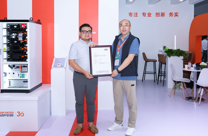 At the booth’s release zone, SGS, an internationally recognized testing, inspection, and certification body, was invited to award Narada's IDC high-voltage lithium battery system with UL 9540A, IEC 62619, and IEC 62477-1 certificates.